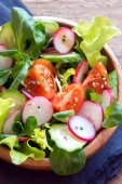 Sałatka z rukola, pomidor, rzodkiewka i mozzarella sera na starym drewnianym stole