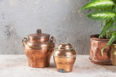 Zdjęcie "Vintage miedzi może i zielonych roślin w mosiądzu i miedzi donice vintage na betonowe podłoże. Kopiować miejsca na tekst" może być wykorzystywane do celów osobistych i komercyjnych zgodnie z warunkami zakupionej licencji Royalty-free. Obraz jest dostępny do pobrania w jakości wysokiej rozdzielczości do 5760x3840.