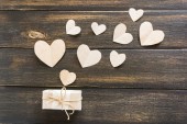 Pola z słowo miłość na białym stole. Prezent w polu z sercem wyciąć. Białe tło.