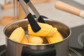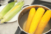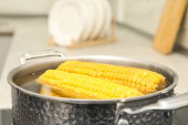 Stewpot z wrzącą wodą i Kukurydza kolby, zbliżenie