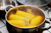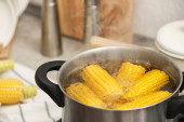 Stewpot z wrzącą wodą i Kukurydza kolby, zbliżenie. Miejsca na tekst