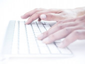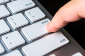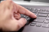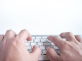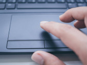 Zbliżenie dłoni dotykając touch pad na klawiaturze komputera laptop czarny.