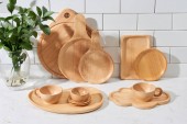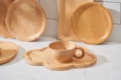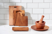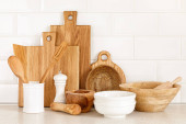 Martwa natura z drewniane naczynia kuchenne na białym tle
