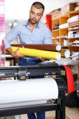 mężczyzna robotnik drukowania z rolki z papieru kolorowego