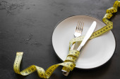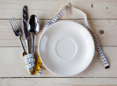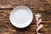 nóż i widelec leży w kształcie krzyża na talerz i taśma pomiarowa na diecie koncepcja drewniane tła