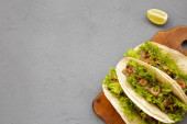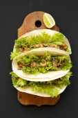 Krewetki tacos na rustykalne drewniane deska na biały drewniany stół, widok z góry. Kuchnia Meksykańska.