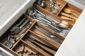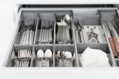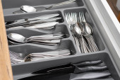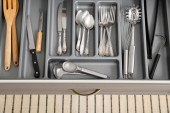 Zdjęcie "Zestaw naczyń. Tacę plastikową z widelce, noże i łyżki w jadalni lub kuchni." może być wykorzystywane do celów osobistych i komercyjnych zgodnie z warunkami zakupionej licencji Royalty-free. Obraz jest dostępny do pobrania w jakości wysokiej rozdzielczości do 5760x3840.