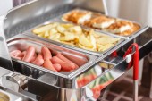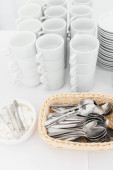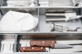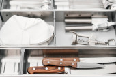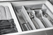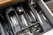 Zestaw naczyń. Tacę plastikową z widelce, noże i łyżki w jadalni lub kuchni.