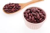 Czerwona fasola w drewniane miski i stawianie na tle pościel i drewniane łyżki.