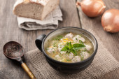 Słodki i kwaśny sos z składników na podłoże drewniane. Przekrój poziomy. Z bliska
