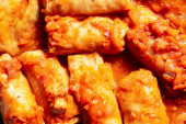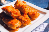 Nadziewane Gołąbki w sosie pomidorowym na talerzu, zbliżenie