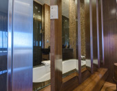 Nowoczesne czyste nowy pokój publiczna toaleta. Automatyczny dozownik mydła i suszarka w lustro