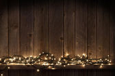 Boże Narodzenie światła na podłoże drewniane widok z góry z lato. Garland światła na Vintage tekstura drewna nowy rok ramki lub makieta Xmas