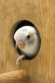 Corella – gatunek ptaka z rodziny Kakadu. Mężczyzna pokazuje samicę gniazdo.