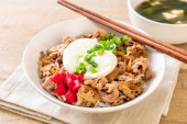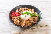 Zdjęcie "miska ryżu wieprzowego z jajkiem (Donburi) - japoński styl jedzenia" może być wykorzystywane do celów osobistych i komercyjnych zgodnie z warunkami zakupionej licencji Royalty-free. Obraz jest dostępny do pobrania w jakości wysokiej rozdzielczości do 5760x3840.