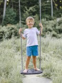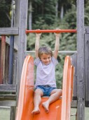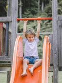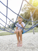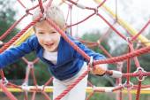 Blond chłopiec zabawy podczas gry na huśtawce małpa na placu zabaw