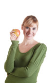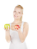 młoda kobieta wesoły w sportowych nosić z apple, na białym tle nad wh