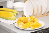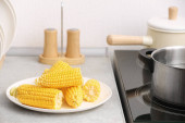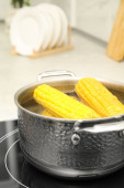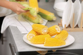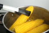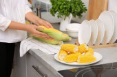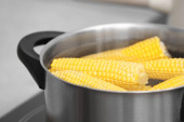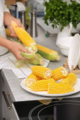 Kobieta, wprowadzenie surowego kukurydzy cob do stewpot na piec, zbliżenie