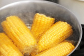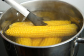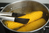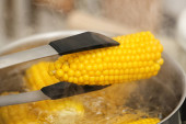 Biorąc kukurydzy cob od stewpot z wrzącą wodą, zbliżenie