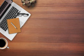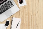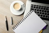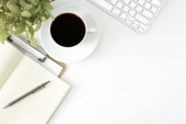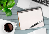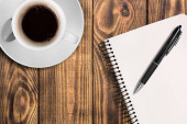 Smartphone, filiżanka kawy, Notatnik i długopis na biurko