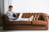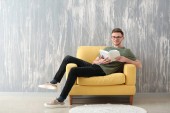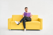 zdenerwowany biznesmen czytanie gazety, siedząc na kanapie żółty, na szaro