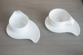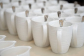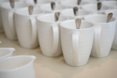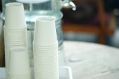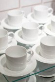 Białe kubki do gorących napojów, ułożone na stole w hotelu
