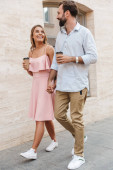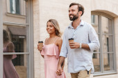 wesoły para w jesienny strój, trzymając się za ręce, patrząc na siebie i chodzenie po ulicy z filiżanki kawy jednorazowe