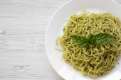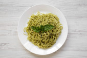 Talerz makaron spaghetti z sosem pesto, nad głową. Z góry płaskie lay.