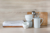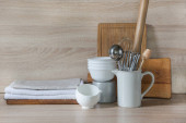 Naczynia, porcelana, białe naczynia i inne różne rzeczy na drewnianym blacie. Kuchnia nadal życia jako tło dla projektu. Miejsce.