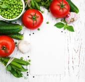 Ekologiczne pomidory i ogórki z bazylią i pościel ręcznik na desce do krojenia na stole w kuchni drewniane.