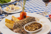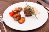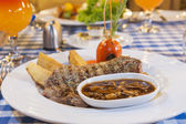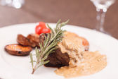 Szczegół zbliżenie wołowiny filet stek w sosie pieprzowym restauracji luksusowych z odkryty powtarzalne jest ustawienie