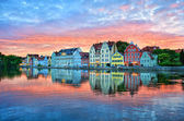 Landshut gotyckie średniowieczne Stare Miasto, Bavaria, Niemcy, odzwierciedlające Isar River w letni dzień w błękitne niebo i białe chmury
