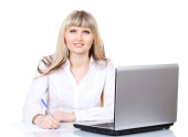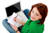 Młoda kobieta wpisywania tekstu na klawiaturze laptopa