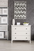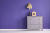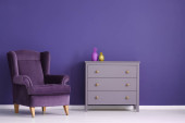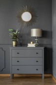 Szafka lampy na i wazon z Burgundii gladiolas przez w wnętrzu salonu meble seksowny szary trzy szuflady. Prawdziwe zdjęcie.