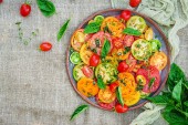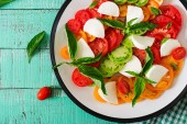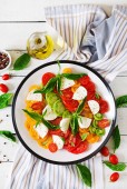 Zdjęcie "Ser mozzarella, pomidory i ziół basil pozostawia w płycie na biały drewniany stół. Sałatka Caprese. Włoskie jedzenie. Widok z góry z miejsca kopii." może być wykorzystywane do celów osobistych i komercyjnych zgodnie z warunkami zakupionej licencji Royalty-free. Obraz jest dostępny do pobrania w jakości wysokiej rozdzielczości do 5760x3840.