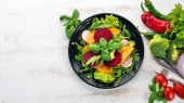 Talerz pokrojone świeże warzywa. Sałatka. Na stare drewniane tła. Ilość wolnego miejsca dla tekstu. Widok z góry.