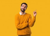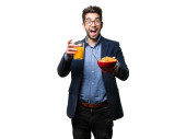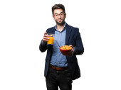 młody człowiek trzyma szklankę soku i na białym tle pomarańczowy