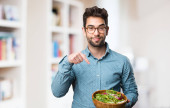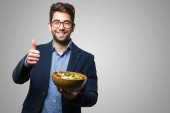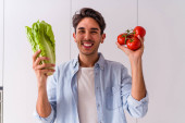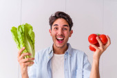 młody człowiek trzyma Sałatka i czekolady na białym tle