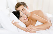 leżąc w łóżku kobieta pokazuje budzik do człowieka