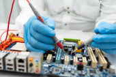 Szczelnie-do góry obraz inżyniera umieszczenie żetonów na obwodów drukowanych