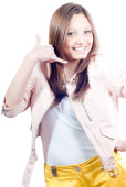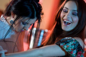 dziewczynka w czerwonej sukience i dziewczyna z torebki