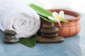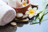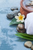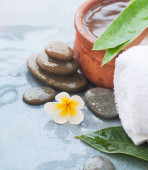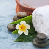 Tropikalny kwiat na zielonych liści i kamienie do masażu