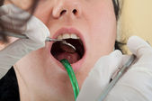 Senior Kobieta w fotelu u dentysty z usta otworzyć podczas leczenia stomatologicznego