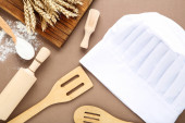 Kapelusz kucharz z wałkiem i pszenica uszy na niebieskim tle