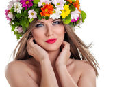 kobieta uroda makijaż twarzy z lato pole dzikie kwiaty świeże na