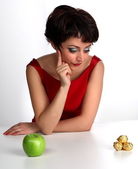 Szczęśliwa młoda kobieta w czerwonej sukience błyszczący. kobieta trzyma się w jej lewym ha
