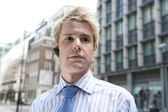 biznesmen korzystania z telefonu komórkowego stojąc w dzielnicy finansowej.