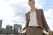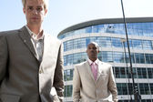 młody biznesmen gry w golfa w samym sercu dzielnicy finansowej.