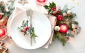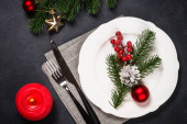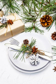 Świąteczna Boże Narodzenie i nowy rok tabela ustawienia w stylu skandynawskim z naturalnym wystrój. Jadalnia miejsce ozdobione jodły zielone drzewo branche i sosna szyszki. Dekoracje swiateczne. Widok z góry.
