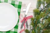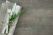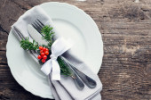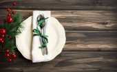 Świąteczne nakrycie na świąteczny obiad na tle rustykalnym starym. Świąteczne nakrycie stołu w stylu skandynawskim z naturalnymi dekoracjami na drewnianym stole. Dekoracje swiateczne. Widok z góry. Miejsce.